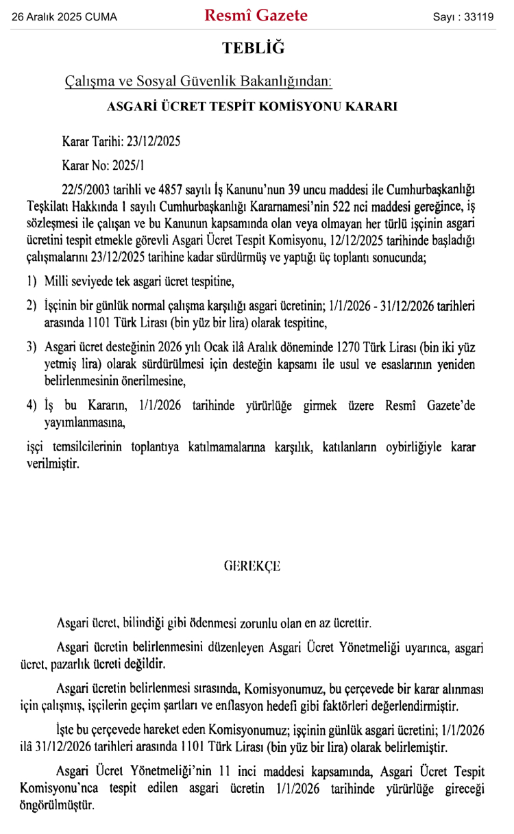 Bugünkü Resmi Gazete’de yayımlanan Asgari Ücret Tespit Komisyonu Kararı ile 2026 yılında geçerli olacak asgari ücret tutarları kesinleşti.