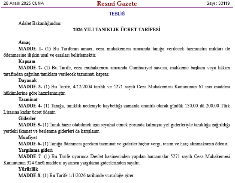 1 Ocak 2026 tarihi itibariyle tanığa, tanıklık nedeniyle kaybettiği zamanla orantılı olarak günlük 130 ile 200 TL’ye kadar ücret ödenmesi kararlaştırıldı. Tanığa ödemesi gereken tazminat ve giderlerde hiçbir vergi, resim ve harç alınmaksızın ödeneceği hüküm altına alındı.