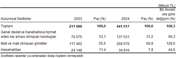 Çevre koruma harcamaları 2024 yılında bir önceki yıla göre %108,3 artarak toplam 441 milyar TL olarak gerçekleşti. Çevre koruma harcamalarının %60,9’u mali ve mali olmayan şirketler, %31,2’si genel devlet ve hanehalkına hizmet eden kar amacı olmayan kuruluşlar ve %7,9’u ise hanehalkları tarafından yapıldı.
