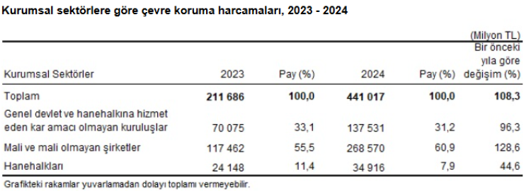 Çevre koruma harcamalarının yüzde 60,9’u mali ve mali olmayan şirketler, yüzde 31,2’si genel devlet ve hanehalkına hizmet eden kar amacı olmayan kuruluşlar ve yüzde 7,9’u ise hanehalkları tarafından yapıldı.