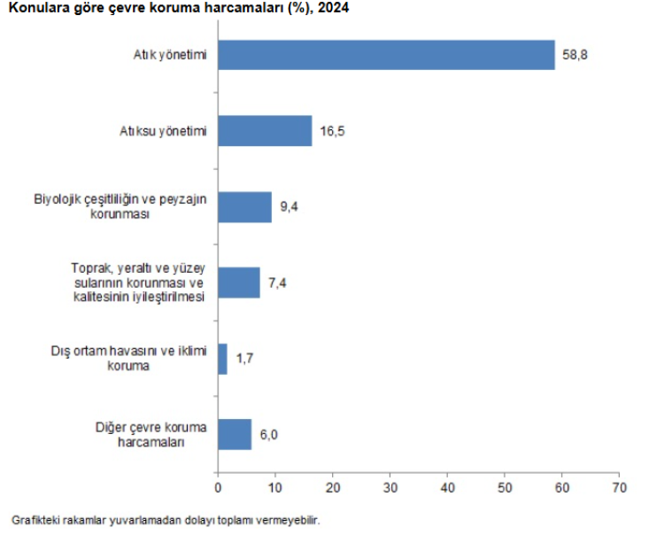 Çevre koruma harcamalarının yüzde 58,8’i atık yönetimi hizmetlerinden, yüzde 16,5’i atıksu yönetimi hizmetlerinden, yüzde 9,4’ü biyolojik çeşitliliğin ve peyzajın korunmasından, yüzde 7,4’ü toprak, yeraltı ve yüzey sularının korunması ve kalitesinin iyileştirilmesinden, yüzde 1,7’si dış ortam havasını ve iklimi korumadan ve yüzde 6’sı ise diğer çevre koruma konularından oluştu.