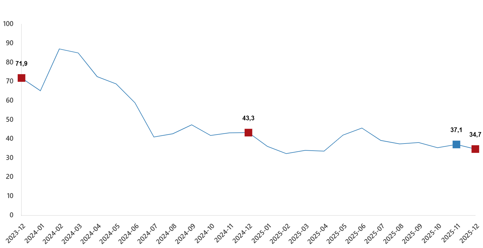Sanayi, inşaat, ticaret ve hizmet sektörleri toplamında ciro endeksi (2021=100), 2025 yılı Aralık ayında yıllık %34,7 arttı.