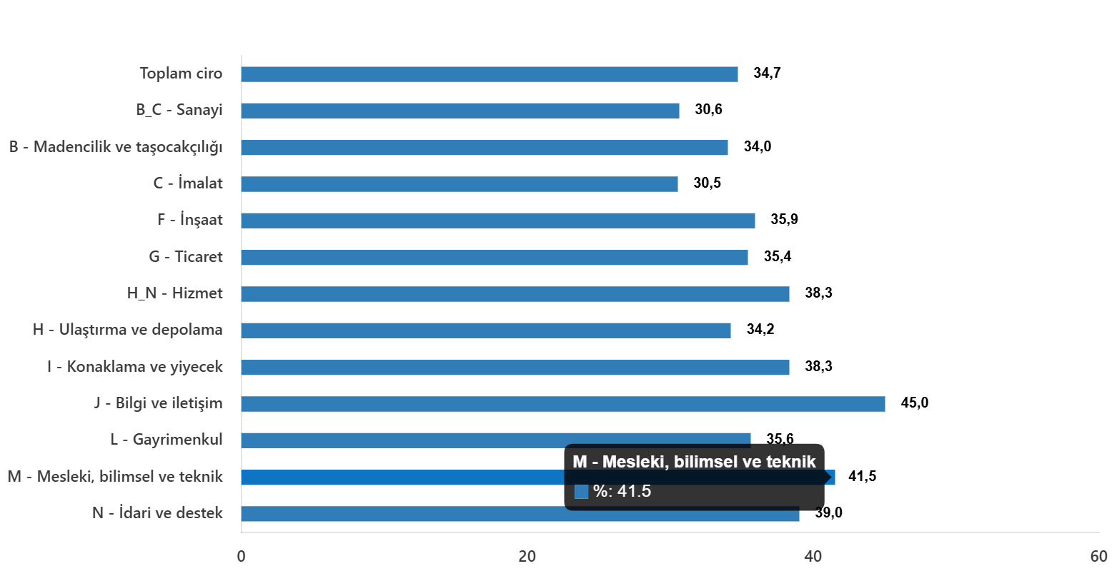 Toplam cironun alt detaylarına bakıldığında; 2025 yılı Aralık ayında yıllık sanayi sektörü ciro endeksi %30,6 arttı, inşaat ciro endeksi %35,9 arttı, ticaret ciro endeksi %35,4 arttı, hizmet ciro endeksi %38,3 arttı.
