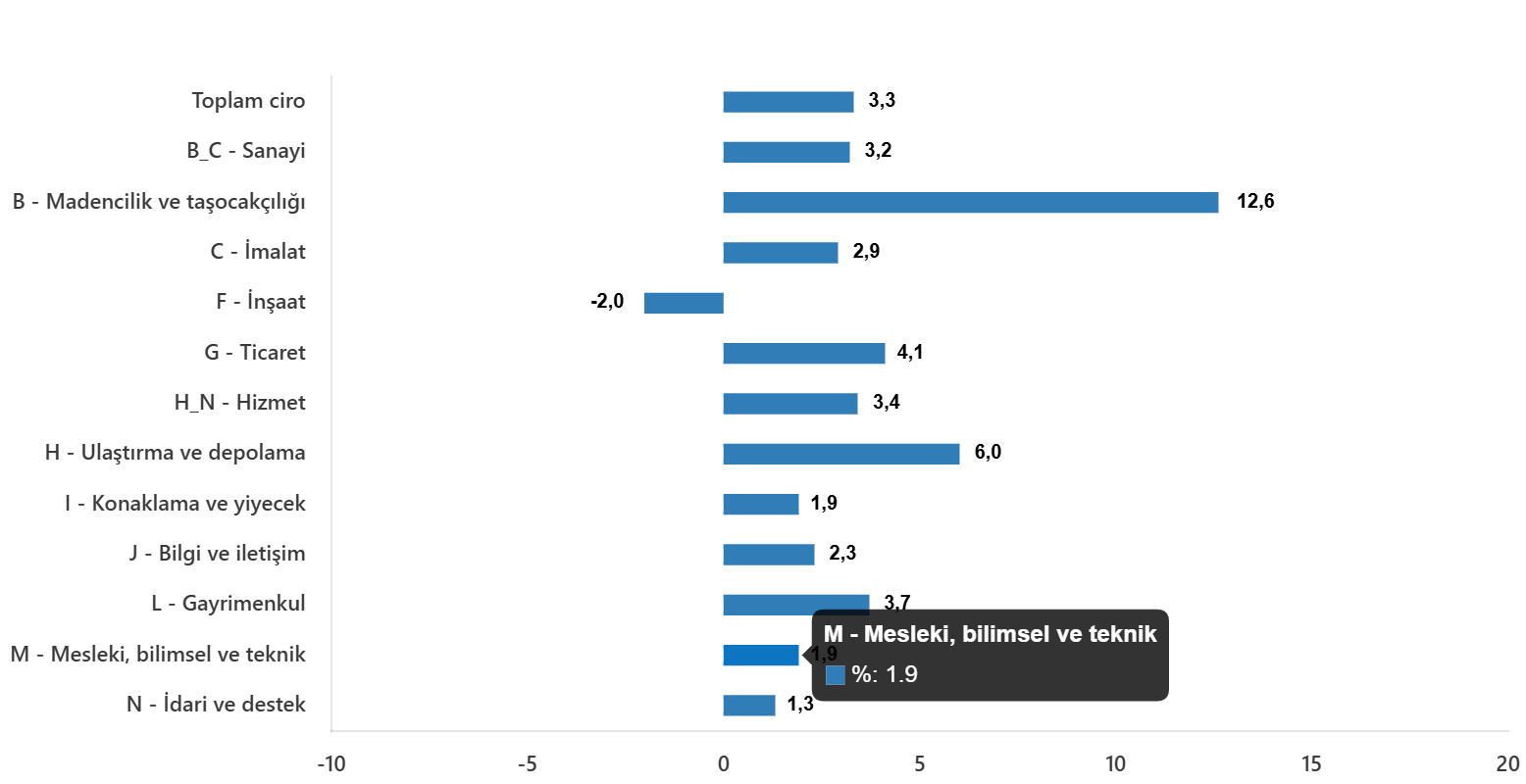 Toplam cironun alt detaylarına bakıldığında; 2025 yılı Aralık ayında aylık sanayi sektörü ciro endeksi %3,2 arttı, inşaat ciro endeksi %2,0 azaldı, ticaret ciro endeksi %4,1 arttı, hizmet ciro endeksi %3,4 arttı.