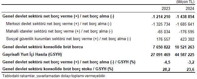 Genel devlet açığı 2024 yılında 1 trilyon 438 milyar 854 milyon TL olarak tahmin edildi ve bir önceki yıl %4,5 olan genel devlet açığının Gayrisafi Yurt İçi Hasıla’ya (GSYH) oranı %3,2’ye düştü. Merkezi devlet ve mahalli idareler alt sektörleri 2024 yılında açık verirken sosyal güvenlik kurumları alt sektörü fazla verdi. Genel devlet konsolide brüt borç stokunun GSYH’ye oranı ise 2024 yılında %23,6’ya düştü.