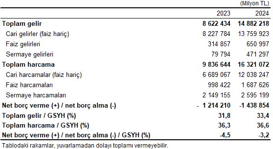 Genel devlet toplam gelirleri 14 trilyon 882 milyar 218 milyon TL’ye yükselirken, gelirlerin GSYH içindeki payı %33,4’e yükseldi. Genel devlet toplam harcamaları 2024 yılında 16 trilyon 321 milyar 72 milyon TL’ye yükselirken, harcamaların GSYH içindeki payı %36,6’ya yükseldi.