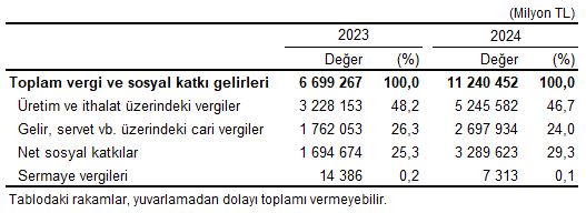 Üretim ve ithalat üzerindeki vergilerin toplam vergi ve sosyal katkı gelirleri içindeki payı 2023 yılında %48,2 iken 2024 yılında %46,7’ye düştü. Gelir, servet vb. üzerindeki cari vergilerin payı %24’e düşerken, net sosyal katkıların payı ise %29,3’e yükseldi. Sermaye vergilerinin payı %0,1’e düştü.