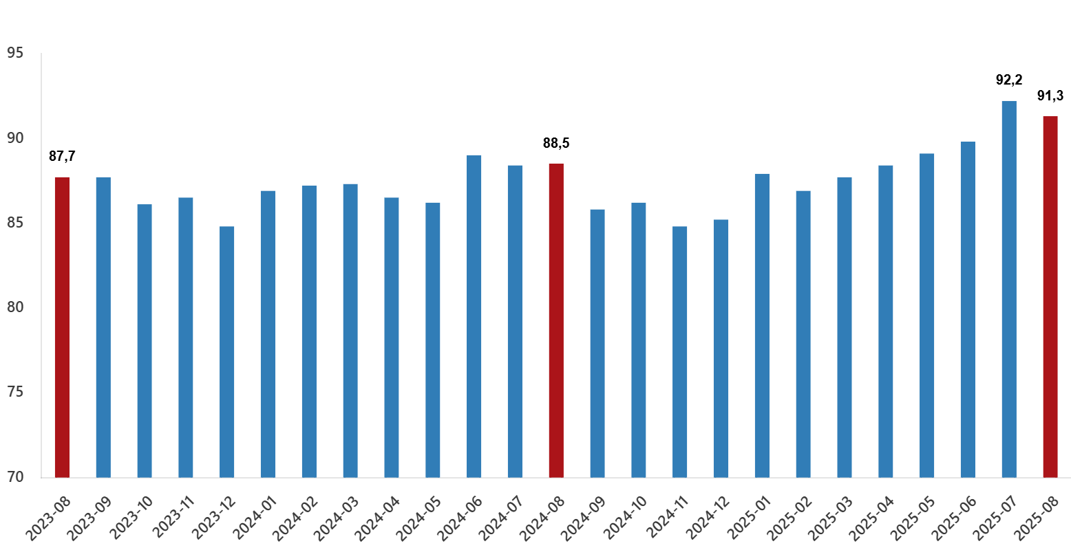 İhracat birim değer endeksinin ithalat birim değer endeksine bölünmesiyle hesaplanan ve 2024 yılı Ağustos ayında 88,5 olarak elde edilmiş olan dış ticaret haddi, 2,8 puan artarak, 2025 yılı Ağustos ayında 91,3 oldu.