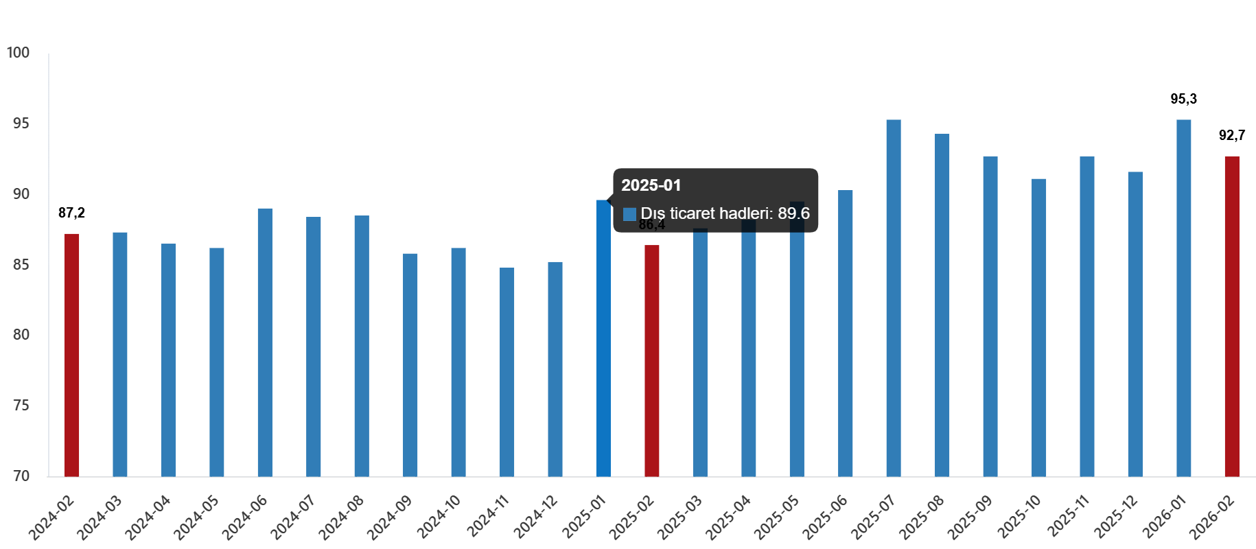 İhracat birim değer endeksinin ithalat birim değer endeksine bölünmesiyle hesaplanan ve 2025 yılı Şubat ayında 86,4 olarak elde edilmiş olan dış ticaret haddi, 6,3 puan artarak, 2026 yılı Şubat ayında 92,7 oldu.