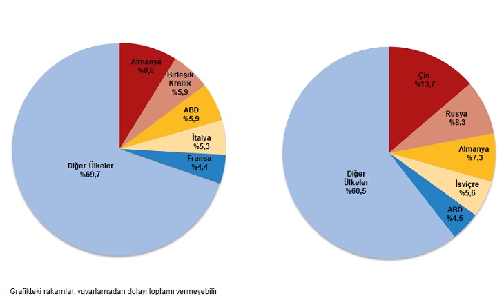 Ocak-Şubat döneminde ithalatta ilk sırayı Çin aldı. Çin’den yapılan ithalat 8 milyar 409 milyon dolar olurken, bu ülkeyi sırasıyla; 5 milyar 576 milyon dolar ile Rusya Federasyonu, 4 milyar 80 milyon dolar ile Almanya, 3 milyar 164 milyon dolar ile ABD, 2 milyar 959 milyon dolar ile İsviçre izledi. İlk 5 ülkeden yapılan ithalat, toplam ithalatın %41,2’sini oluşturdu.