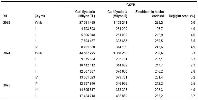 Üretim yöntemiyle Gayrisafi Yurt İçi Hasıla tahmini, 2025 yılının üçüncü çeyreğinde cari fiyatlarla bir önceki yılın aynı çeyreğine göre %41,6 artarak 17 trilyon 424 milyar 718 milyon TL oldu. GSYH’nin üçüncü çeyrek değeri cari fiyatlarla ABD doları bazında 432 milyar 880 milyon olarak gerçekleşti.