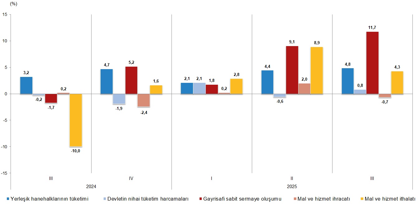 Yerleşik hanehalklarının nihai tüketim harcamaları 2025 yılının üçüncü çeyreğinde bir önceki yılın aynı çeyreğine göre zincirlenmiş hacim endeksi olarak %4,8 arttı. Devletin nihai tüketim harcamaları %0,8, gayrisafi sabit sermaye oluşumu ise %11,7 arttı.