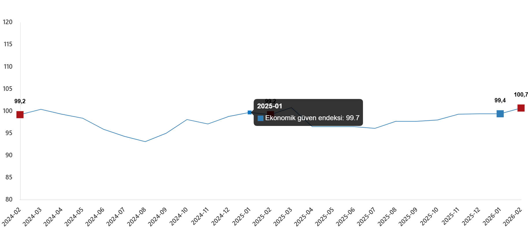 Ekonomik güven endeksi Ocak ayında 99,4 iken, Şubat ayında %1,4 oranında artarak 100,7 değerini aldı.