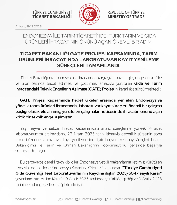 Gerekli teknik bilgiler Endonezya yetkililerine iletildi ve yapılan temaslar sonucu Endonezya Karantina Otoritesi, “Türkiye Cumhuriyeti Gıda Güvenliği Test Laboratuvarlarının Kaydına ilişkin 2025/6047 sayılı Karar”ı yayımladı. Karar, 9 Aralık 2025 tarihinde yürürlüğe girdi ve 9 Aralık 2028 tarihine kadar geçerli olacak.