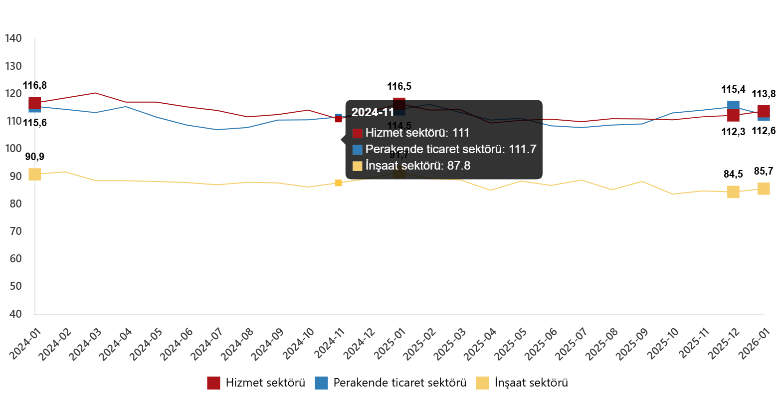 Mevsim etkilerinden arındırılmış güven endeksi Ocak ayında bir önceki aya göre; hizmet sektöründe %1,3 oranında artarak 113,8 değerini, perakende ticaret sektöründe %2,4 oranında azalarak 112,6 değerini ve inşaat sektöründe %1,5 oranında artarak 85,7 değerini aldı.