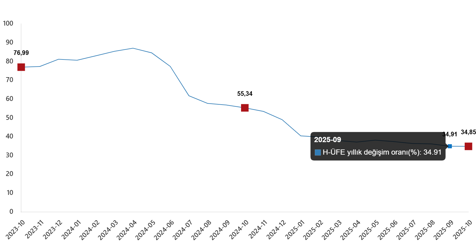 H-ÜFE 2025 yılı Ekim ayında bir önceki aya göre %0,19 artış, bir önceki yılın Aralık ayına göre %35,02 artış, bir önceki yılın aynı ayına göre %34,85 artış ve on iki aylık ortalamalara göre %38,96 artış gösterdi.
