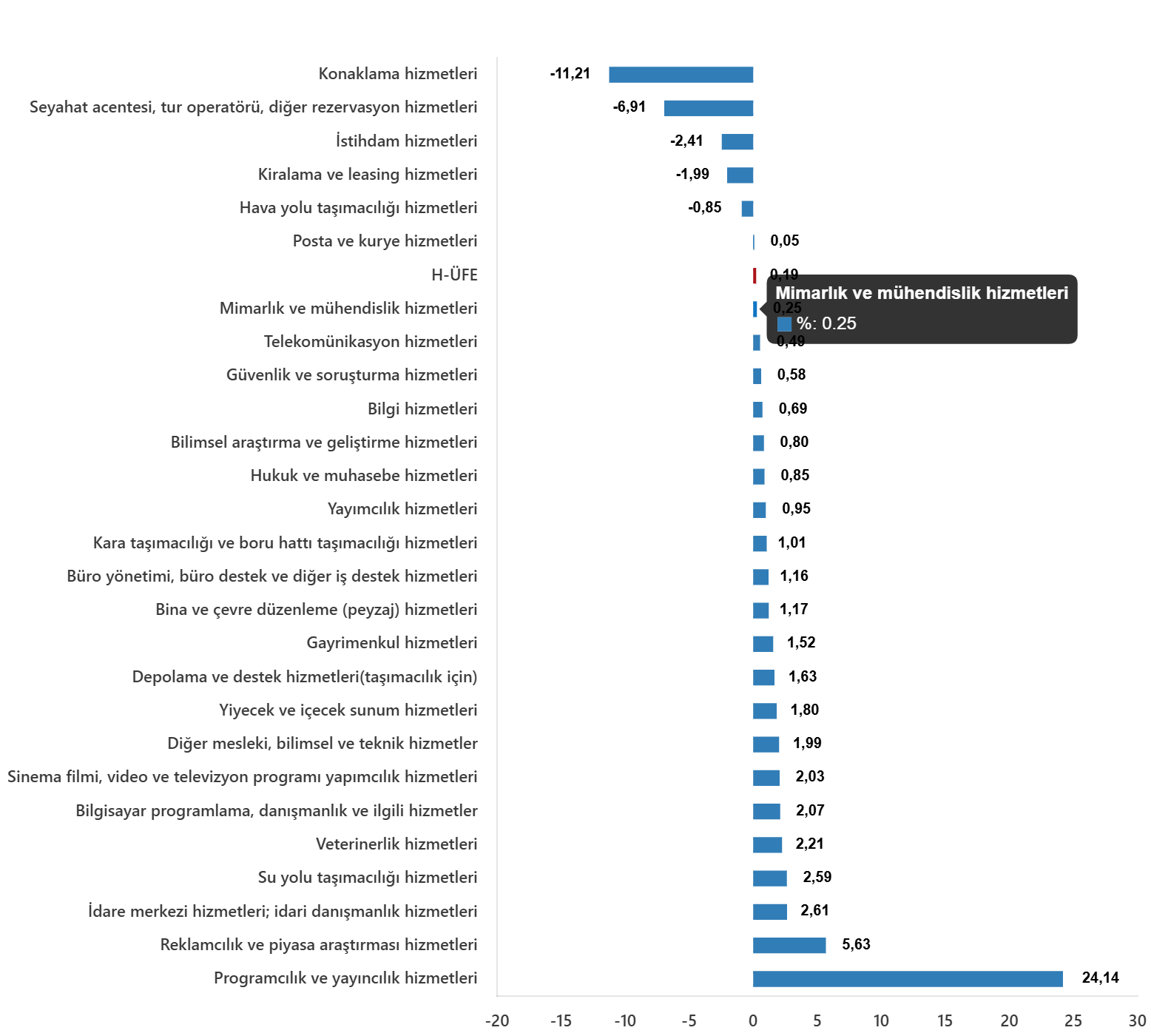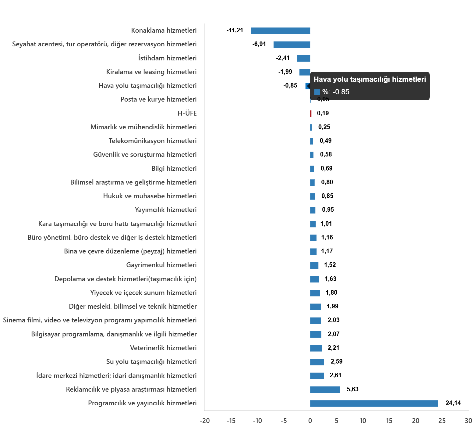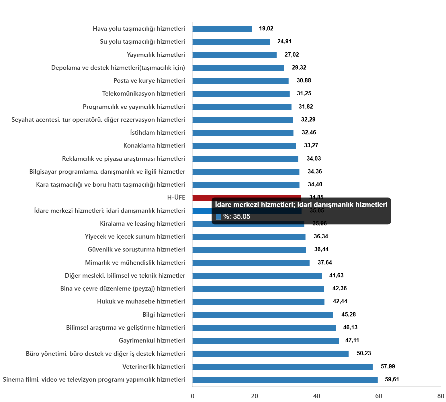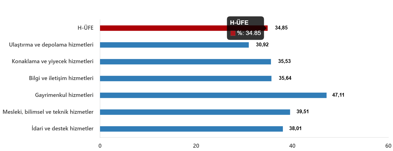 Bir önceki yılın aynı ayına göre, ulaştırma ve depolama hizmetlerinde %30,92 artış, konaklama ve yiyecek hizmetlerinde %35,53 artış, bilgi ve iletişim hizmetlerinde %35,64 artış, gayrimenkul hizmetlerinde %47,11 artış, mesleki, bilimsel ve teknik hizmetlerde %39,51 artış, idari ve destek hizmetlerde %38,01 artış gerçekleşti.