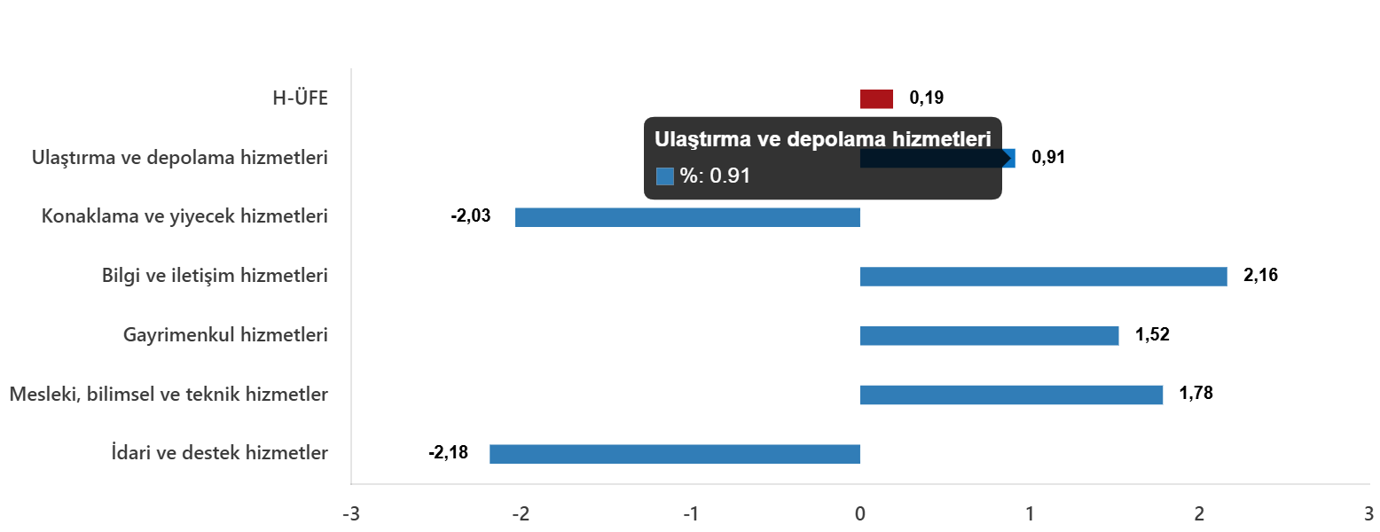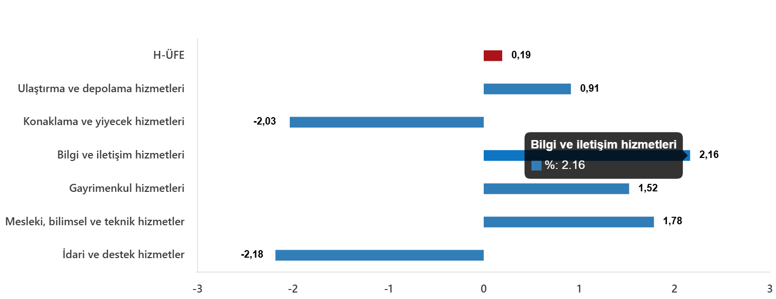 Bir önceki aya göre, ulaştırma ve depolama hizmetlerinde %0,91 artış, konaklama ve yiyecek hizmetlerinde %2,03 azalış, bilgi ve iletişim hizmetlerinde %2,16 artış, gayrimenkul hizmetlerinde %1,52 artış, mesleki, bilimsel ve teknik hizmetlerde %1,78 artış, idari ve destek hizmetlerde %2,18 azalış gerçekleşti.
