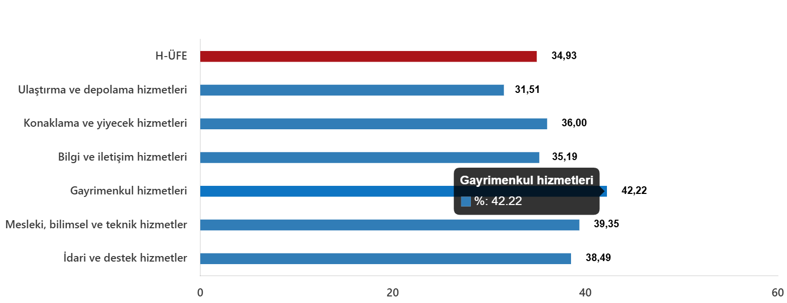 Bir önceki yılın aynı ayına göre, ulaştırma ve depolama hizmetlerinde %31,51 artış, konaklama ve yiyecek hizmetlerinde %36,00 artış, bilgi ve iletişim hizmetlerinde %35,19 artış, gayrimenkul hizmetlerinde %42,22 artış, mesleki, bilimsel ve teknik hizmetlerde %39,35 artış, idari ve destek hizmetlerde %38,49 artış gerçekleşti.
