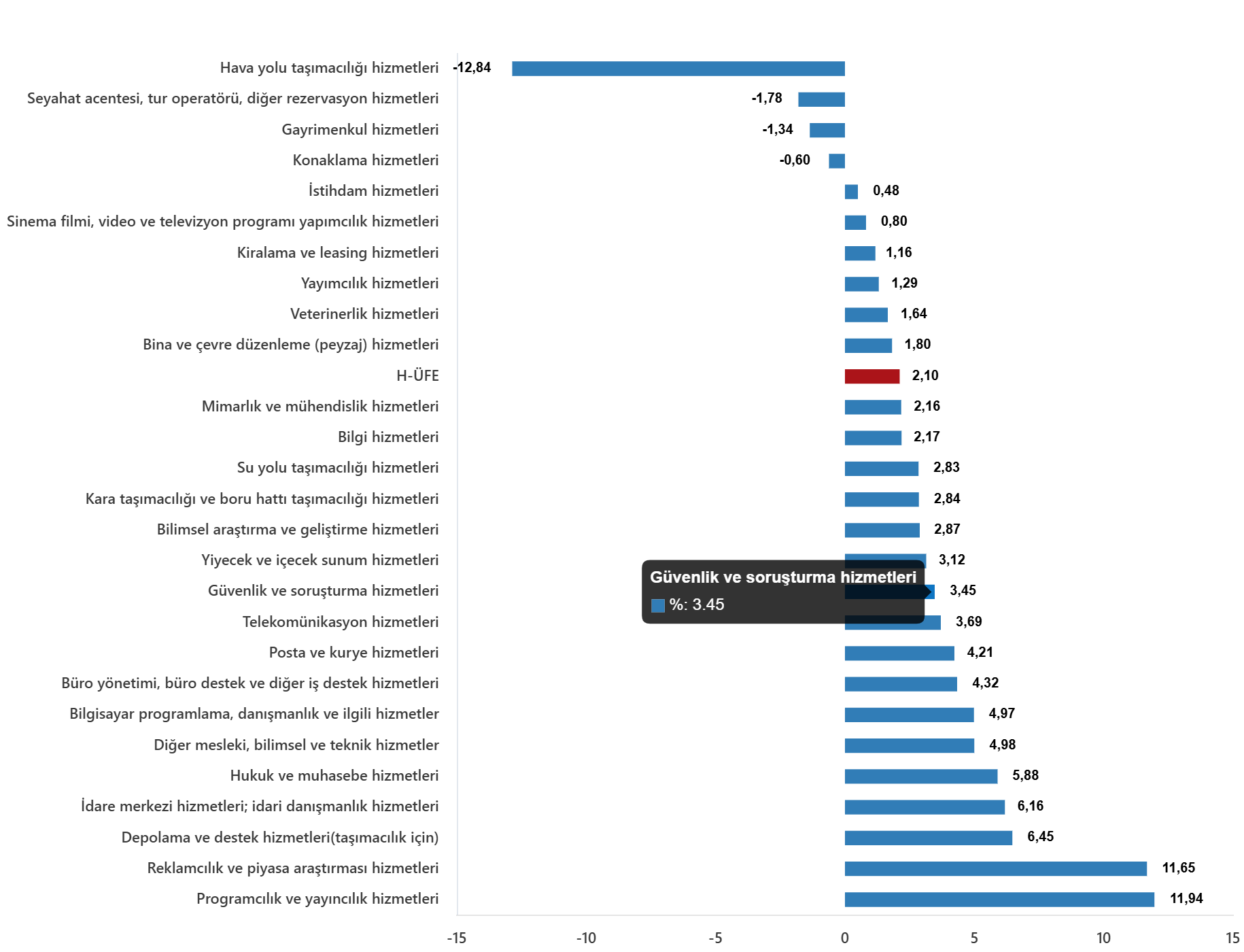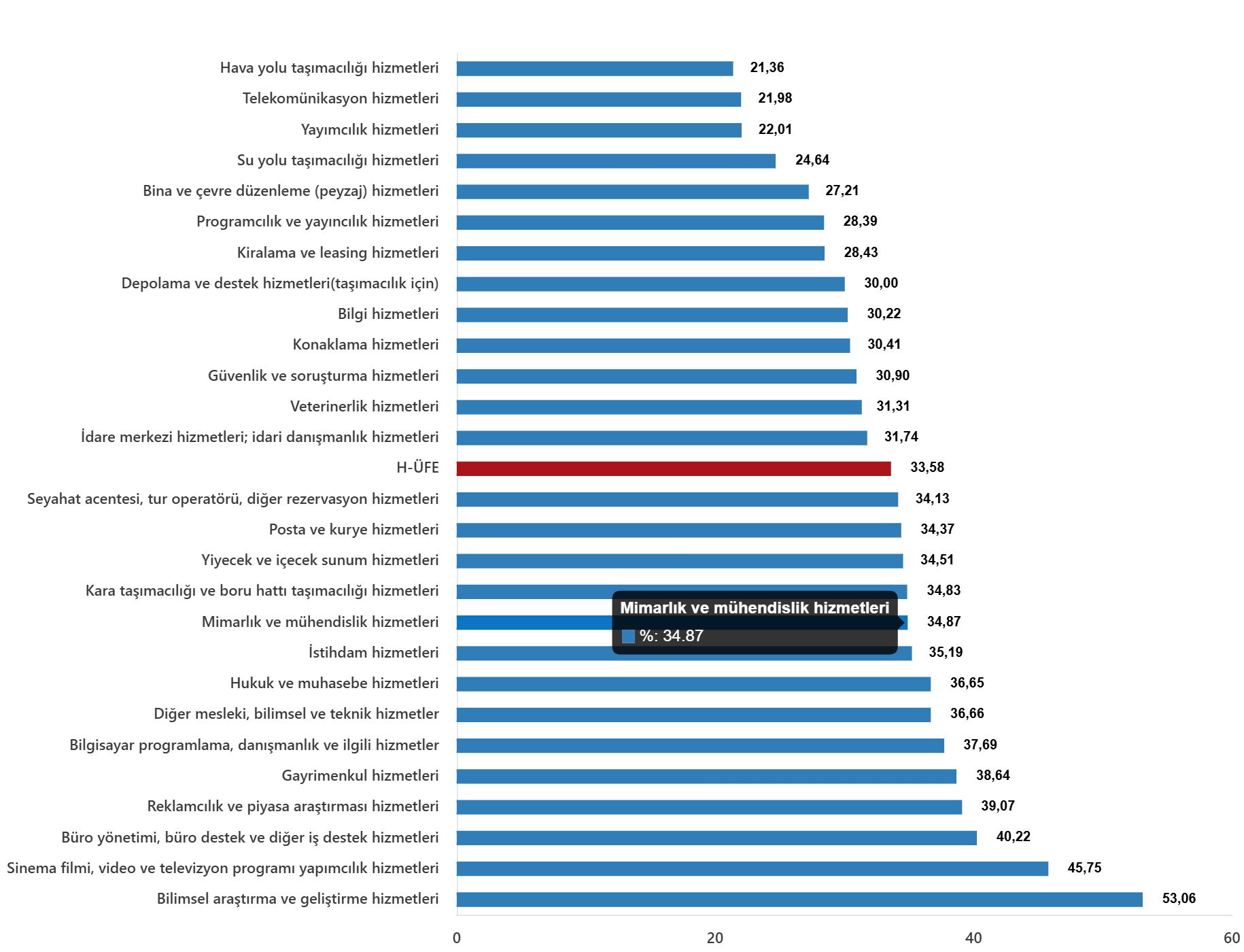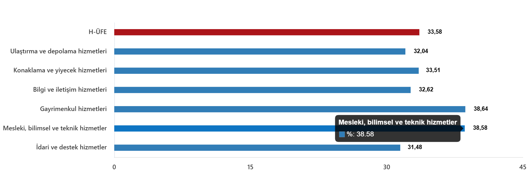 Bir önceki yılın aynı ayına göre, ulaştırma ve depolama hizmetlerinde %32,04 artış, konaklama ve yiyecek hizmetlerinde %33,51 artış, bilgi ve iletişim hizmetlerinde %32,62 artış, gayrimenkul hizmetlerinde %38,64 artış, mesleki, bilimsel ve teknik hizmetlerde %38,58 artış, idari ve destek hizmetlerde %31,48 artış gerçekleşti.