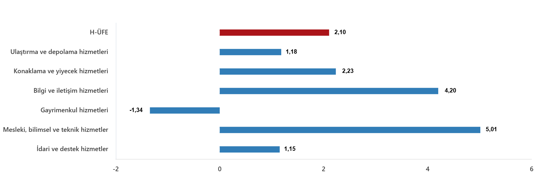 Bir önceki aya göre, ulaştırma ve depolama hizmetlerinde %1,18 artış, konaklama ve yiyecek hizmetlerinde %2,23 artış, bilgi ve iletişim hizmetlerinde %4,20 artış, gayrimenkul hizmetlerinde %1,34 azalış, mesleki, bilimsel ve teknik hizmetlerde %5,01 artış, idari ve destek hizmetlerde %1,15 artış gerçekleşti.