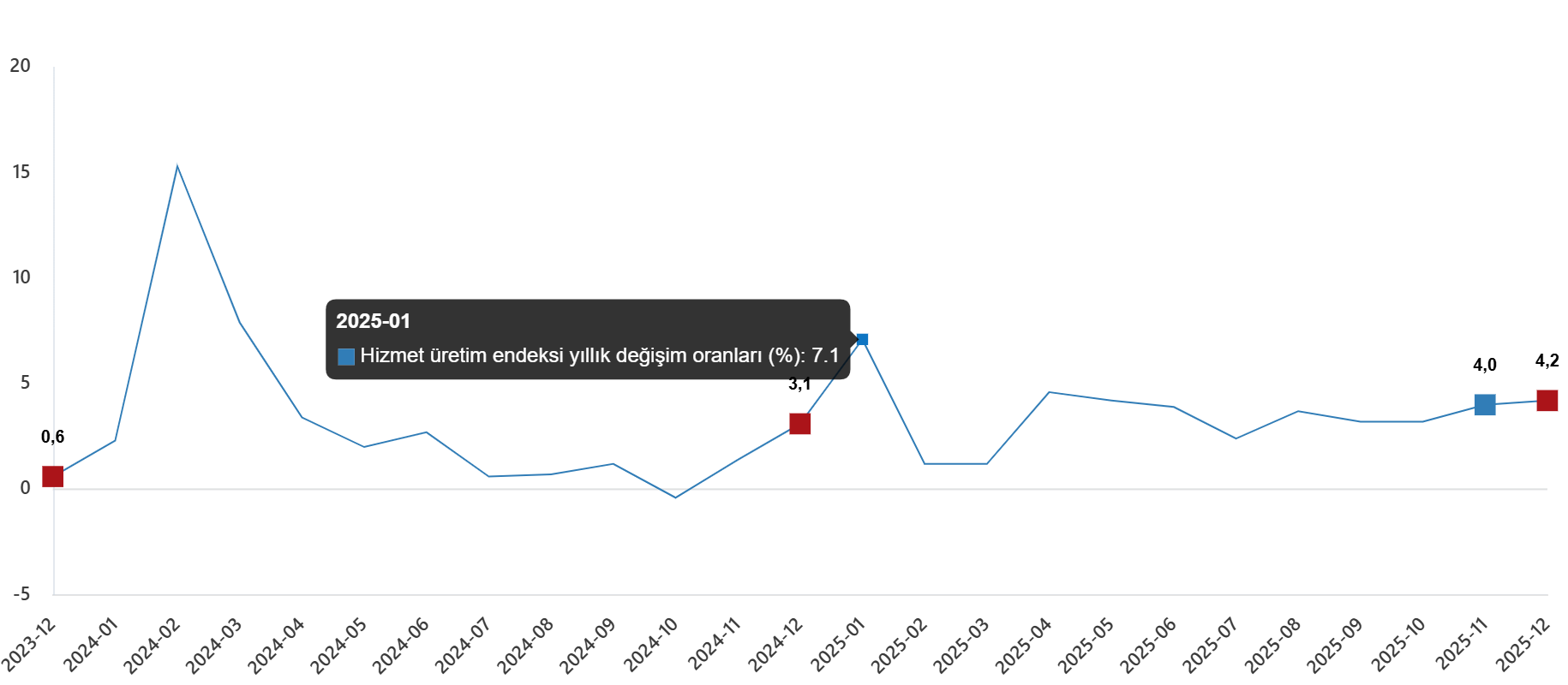 Hizmet üretim endeksi (2021=100) 2025 yılı Aralık ayında bir önceki yılın aynı ayına göre %4,2 arttı. Aynı ayda ulaştırma ve depolama hizmetleri %3,5 arttı, konaklama ve yiyecek hizmetleri %5,2 arttı, bilgi ve iletişim hizmetleri %5,0 arttı, gayrimenkul hizmetleri %0,5 azaldı, mesleki, bilimsel ve teknik hizmetler %3,0 arttı, idari ve destek hizmetleri ise %4,6 arttı.