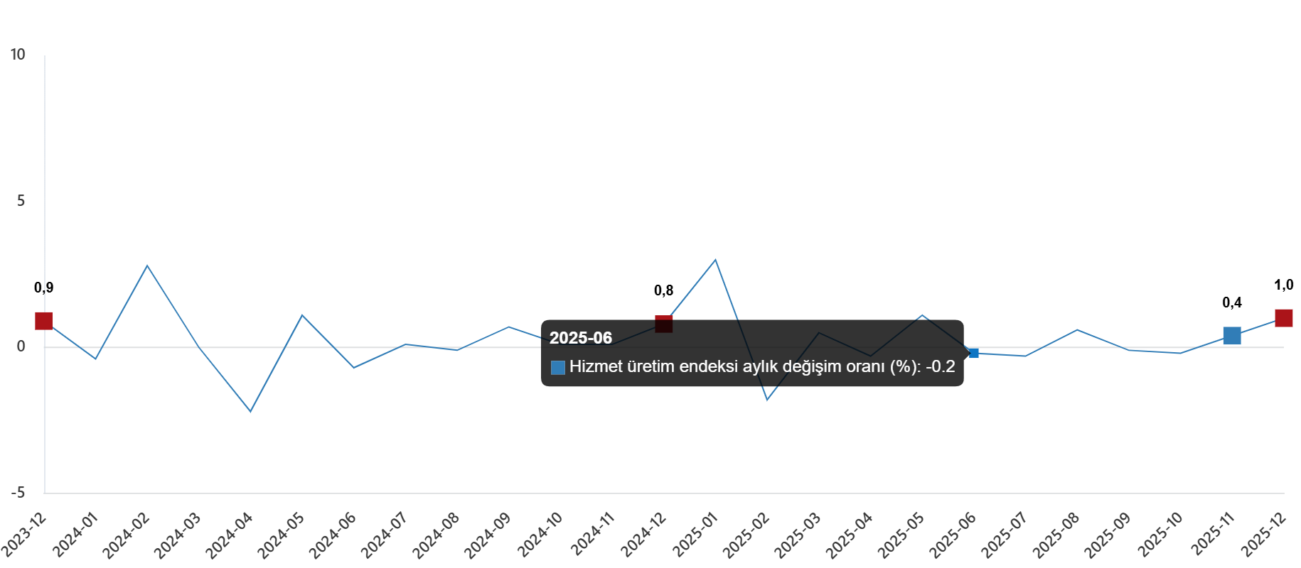 Hizmet üretim endeksi (2021=100) 2025 yılı Aralık ayında bir önceki aya göre %1,0 arttı. Aynı ayda ulaştırma ve depolama hizmetleri %3,3 arttı, konaklama ve yiyecek hizmetleri %0,5 arttı, bilgi ve iletişim hizmetleri %0,5 azaldı, gayrimenkul hizmetleri %0,7 arttı, mesleki, bilimsel ve teknik hizmetler %1,3 azaldı, idari ve destek hizmetleri ise %1,3 azaldı.