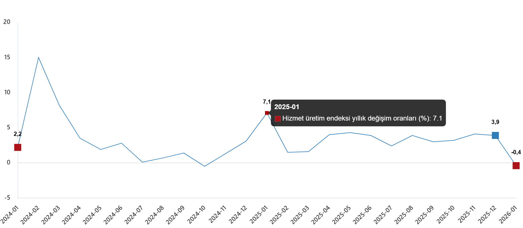 Hizmet üretim endeksi (2021=100) 2026 yılı Ocak ayında bir önceki yılın aynı ayına göre %0,4 azaldı. Aynı ayda ulaştırma ve depolama hizmetleri %4,7 azaldı, konaklama ve yiyecek hizmetleri %5,9 arttı, bilgi ve iletişim hizmetleri %7,5 arttı, gayrimenkul hizmetleri %1,3 azaldı, mesleki, bilimsel ve teknik hizmetler %1,8 azaldı, idari ve destek hizmetleri ise %0,1 arttı.