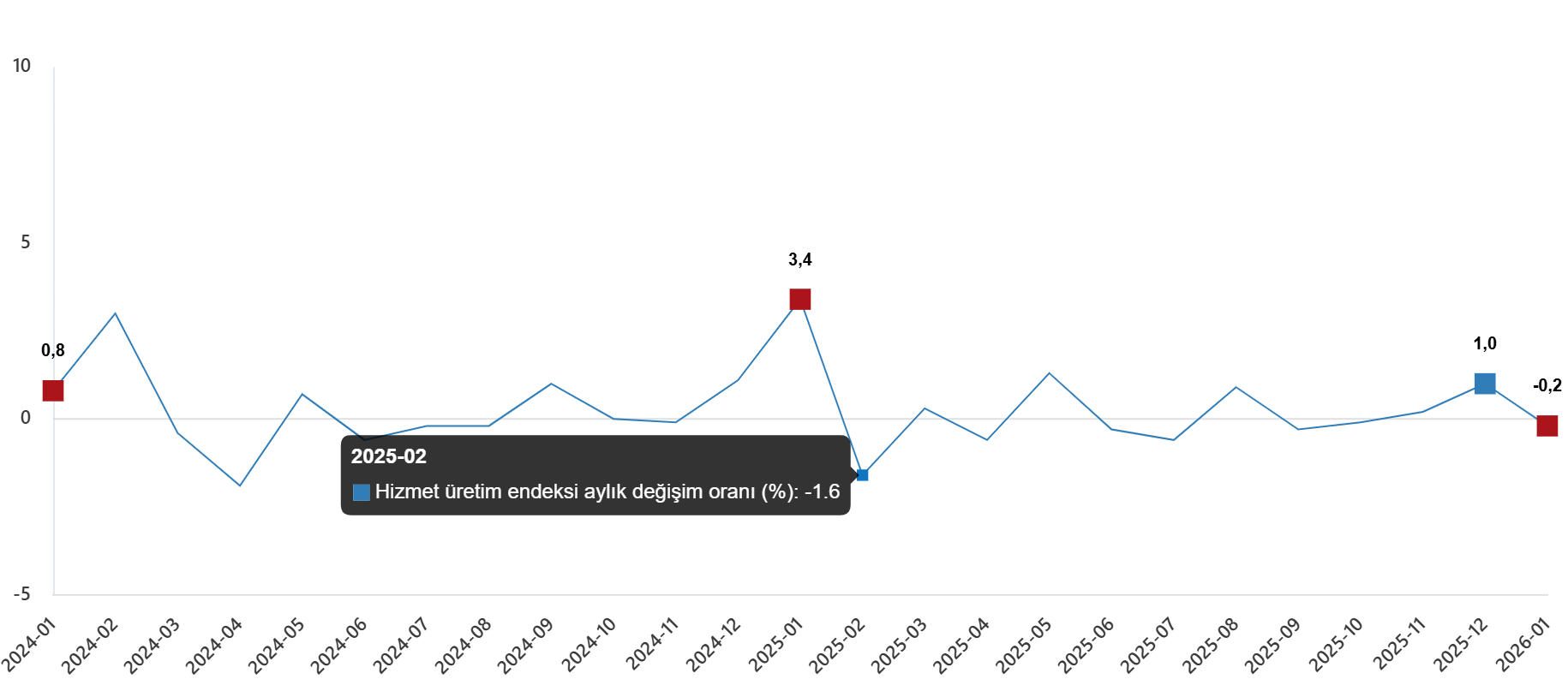 Hizmet üretim endeksi (2021=100) 2026 yılı Ocak ayında bir önceki aya göre %0,2 azaldı. Aynı ayda ulaştırma ve depolama hizmetleri %4,3 azaldı, konaklama ve yiyecek hizmetleri %0,6 arttı, bilgi ve iletişim hizmetleri %3,6 arttı, gayrimenkul hizmetleri %4,4 arttı, mesleki, bilimsel ve teknik hizmetler %5,5 arttı, idari ve destek hizmetleri ise %1,7 arttı.
