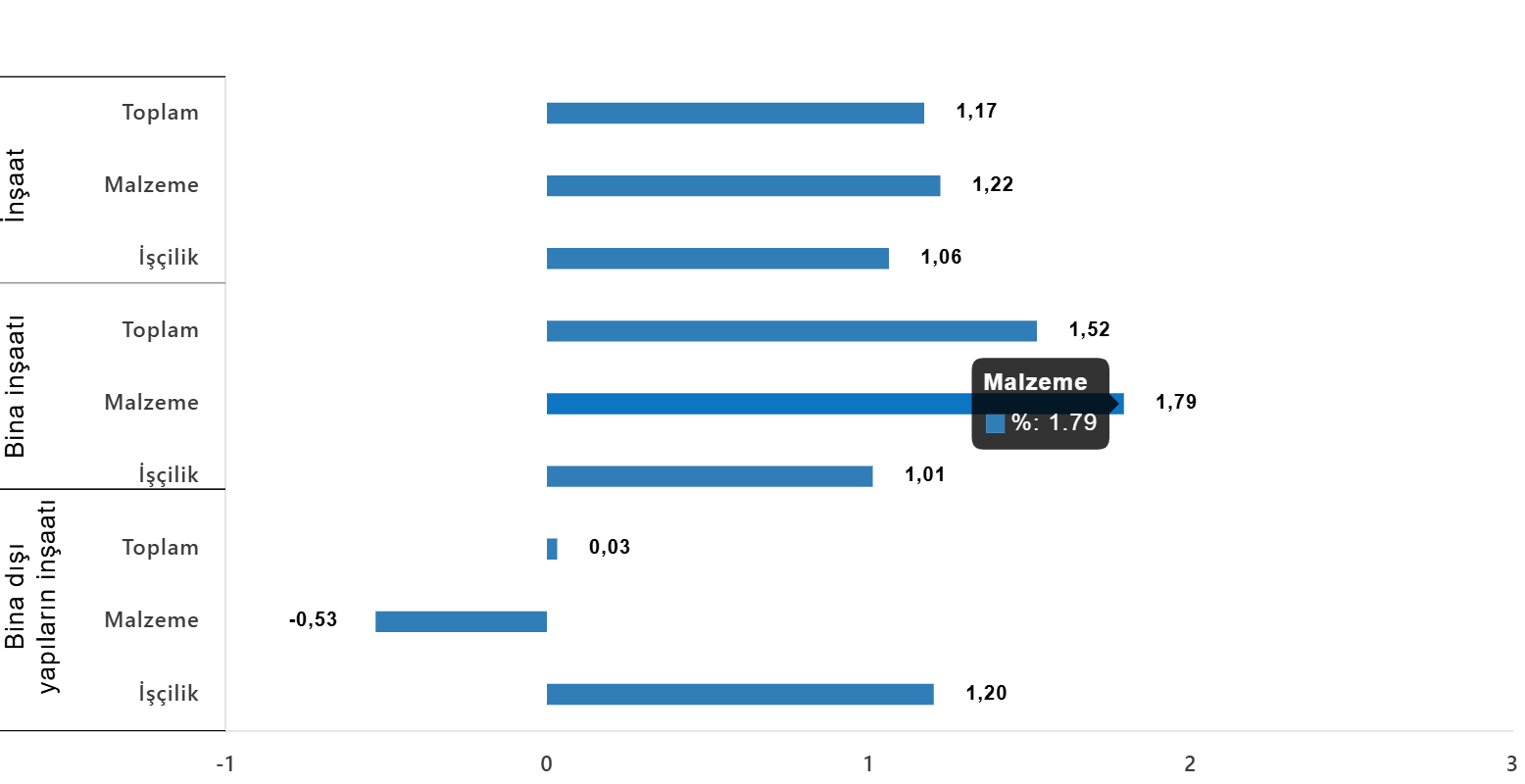 Bina inşaatı maliyet endeksi, bir önceki aya göre %1,52 arttı, bir önceki yılın aynı ayına göre %24,55 arttı. Bir önceki aya göre malzeme endeksi %1,79 arttı, işçilik endeksi %1,01 arttı. Ayrıca bir önceki yılın aynı ayına göre malzeme endeksi %21,70 arttı, işçilik endeksi %30,16 arttı.