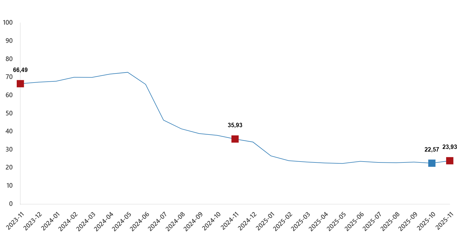 İnşaat maliyet endeksi, 2025 yılı Kasım ayında bir önceki aya göre %1,14 arttı, bir önceki yılın aynı ayına göre %23,93 arttı. Bir önceki aya göre malzeme endeksi %1,70 arttı, işçilik endeksi %0,12 arttı. Ayrıca bir önceki yılın aynı ayına göre malzeme endeksi %20,48 arttı, işçilik endeksi %30,98 arttı.