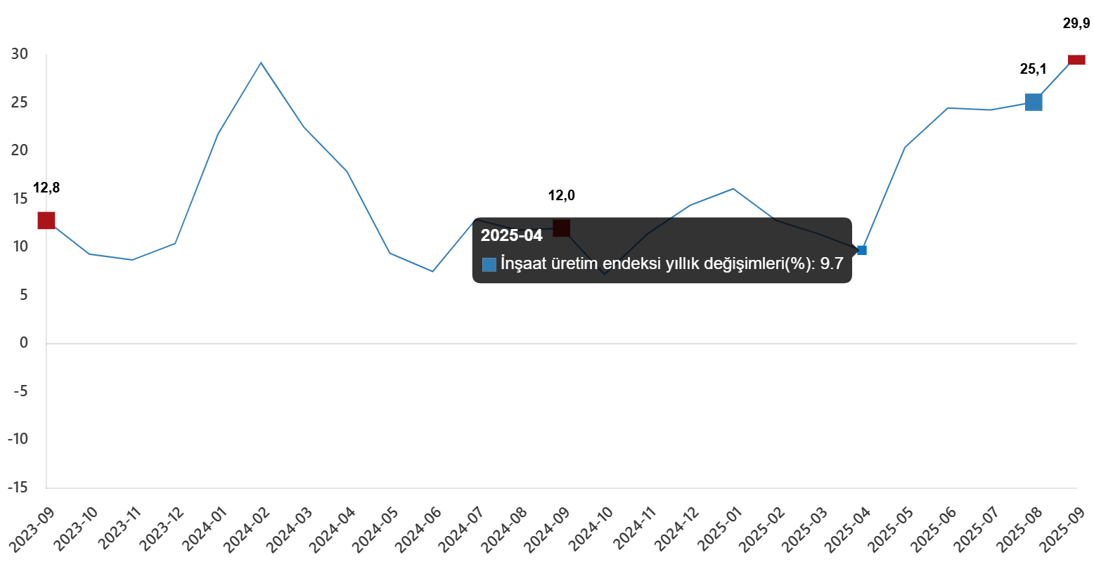 İnşaatın alt sektörleri (2021=100 referans yıllı) incelendiğinde, 2025 yılı Eylül ayında bina inşaatı sektörü endeksi bir önceki yılın aynı ayına göre %31,2 arttı, bina dışı yapıların inşaatı sektörü endeksi %23,3 arttı ve özel inşaat faaliyetleri sektörü endeksi %30,1 arttı.
