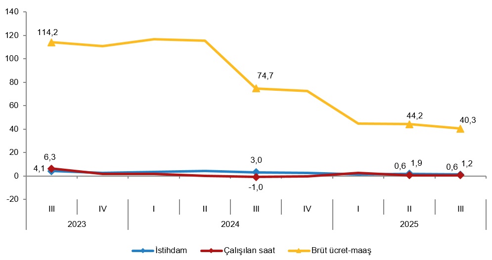 Sanayi, inşaat ve ticaret-hizmet sektörleri toplamında brüt ücret-maaş endeksi, 2025 yılı III. çeyreğinde bir önceki yılın aynı çeyreğine göre %40,3 arttı. Alt sektörler incelendiğinde, endeks; sanayi sektöründe %34,5, inşaat sektöründe %44,4 ve ticaret-hizmet sektörlerinde %43,5 arttı.