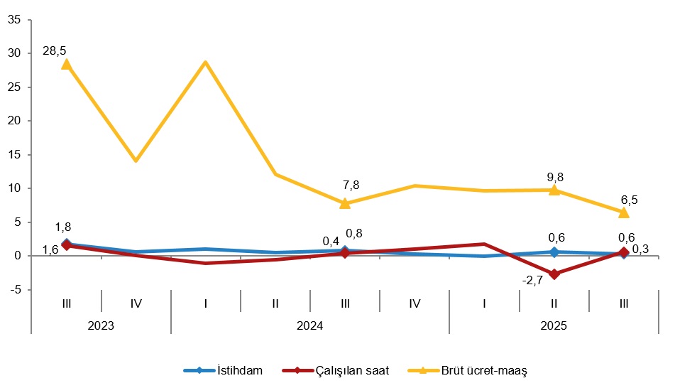 Sanayi, inşaat ve ticaret-hizmet sektörleri toplamında brüt ücret-maaş endeksi, 2025 yılı III. çeyreğinde bir önceki çeyreğe göre %6,5 arttı. Alt sektörler incelendiğinde, endeks; sanayi sektöründe %4,8, inşaat sektöründe %7,7 ve ticaret-hizmet sektörlerinde %7,3 arttı.