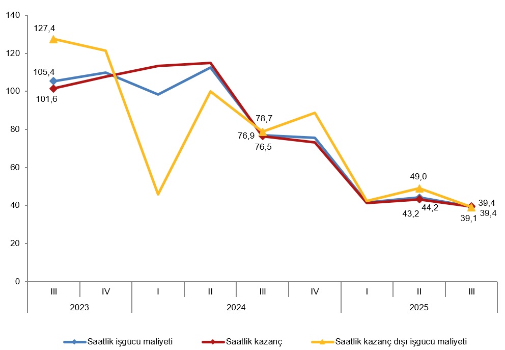 Sanayi, inşaat ve ticaret-hizmet sektörleri toplamında saatlik kazanç dışı işgücü maliyeti endeksi, 2025 yılı III. çeyreğinde bir önceki yılın aynı çeyreğine göre %39,1 arttı. Alt sektörler incelendiğinde, endeks; sanayi sektöründe %37,4, inşaat sektöründe %40,8 ve ticaret-hizmet sektörlerinde %41,5 arttı.