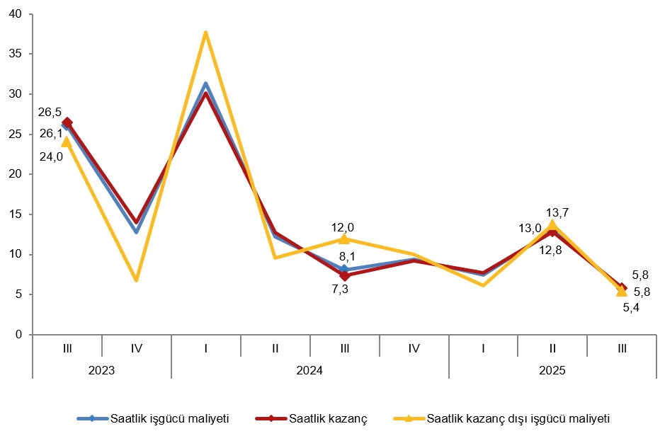 Sanayi, inşaat ve ticaret-hizmet sektörleri toplamında saatlik işgücü maliyeti endeksi, 2025 yılı III. çeyreğinde bir önceki çeyreğe göre %5,8 arttı. Alt sektörler incelendiğinde, endeks; sanayi sektöründe %5,6, inşaat sektöründe %3,5 ve ticaret-hizmet sektörlerinde %6,6 arttı.