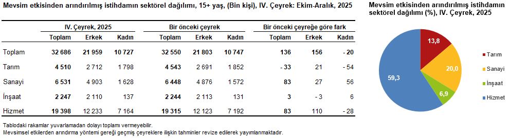 Mevsim etkisinden arındırılmış istihdam edilenlerin sayısı 2025 yılı IV. çeyreğinde bir önceki çeyreğe göre tarım sektöründe 33 bin kişi azalırken, sanayi sektöründe 83 bin kişi, inşaat sektöründe 3 bin kişi, hizmet sektöründe 83 bin kişi arttı. İstihdam edilenlerin %13,8’i tarım, %20,0’ı sanayi, %6,9’u inşaat, %59,3’ü ise hizmet sektöründe yer aldı.
