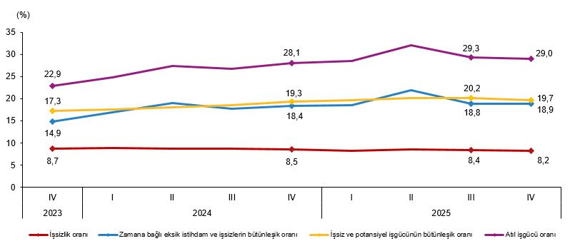 Zamana bağlı eksik istihdam, potansiyel işgücü ve işsizlerden oluşan atıl işgücü oranı 2025 yılı IV. çeyreğinde bir önceki çeyreğe göre 0,3 puanlık azalış ile %29,0 oldu. Zamana bağlı eksik istihdam ve işsizlerin bütünleşik oranı %18,9 iken potansiyel işgücü ve işsizlerin bütünleşik oranı %19,7 olarak tahmin edildi.