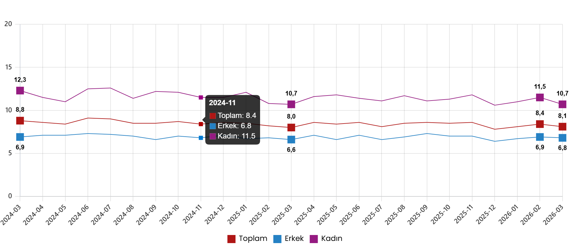 Hanehalkı İşgücü Araştırması sonuçlarına göre; 15 ve daha yukarı yaştaki kişilerde işsiz sayısı 2026 yılı Mart ayında bir önceki aya göre 96 bin kişi azalarak 2 milyon 873 bin kişi oldu. İşsizlik oranı ise 0,3 puan azalarak %8,1 seviyesinde gerçekleşti. İşsizlik oranı erkeklerde %6,8 iken kadınlarda %10,7 olarak tahmin edildi.