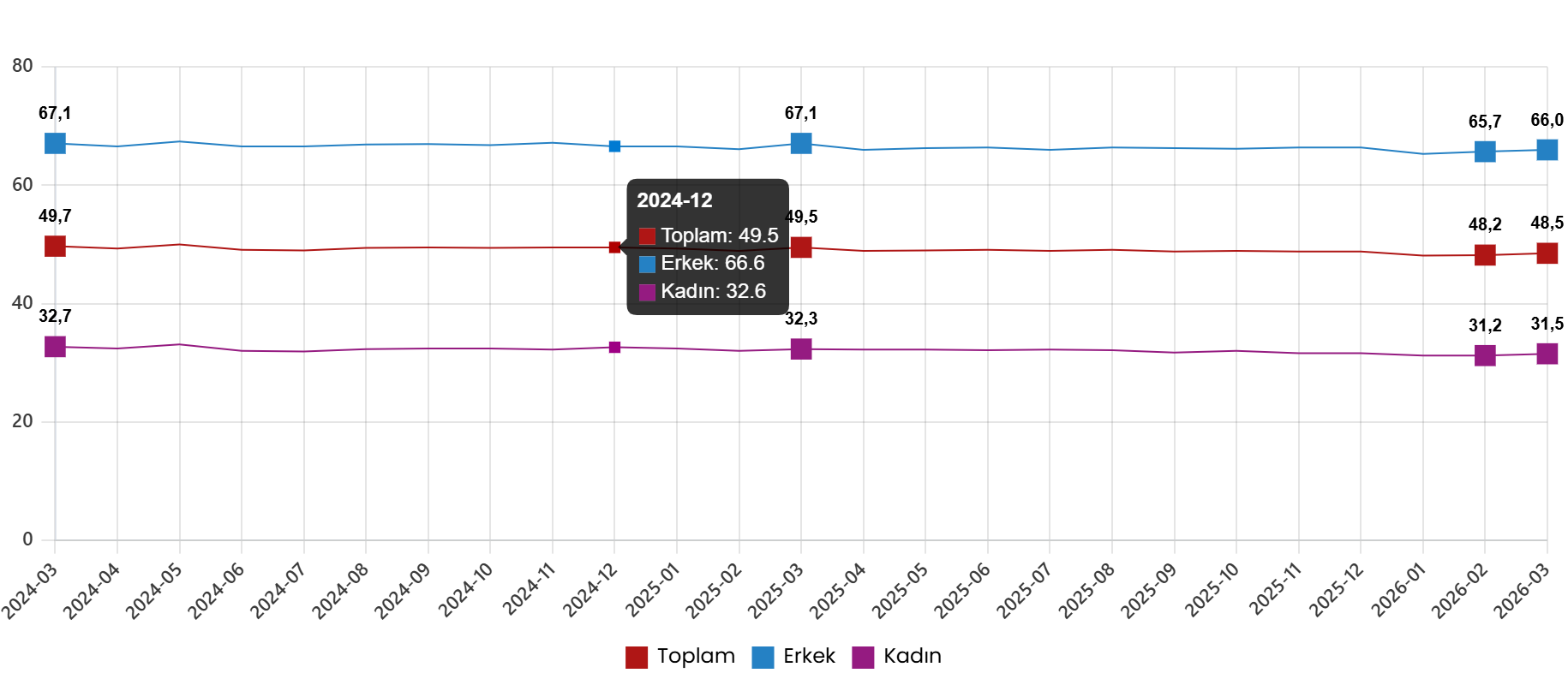 İstihdam edilenlerin sayısı 2026 yılı Mart ayında bir önceki aya göre 226 bin kişi artarak 32 milyon 425 bin kişi, istihdam oranı ise 0,3 puan artarak %48,5 oldu. Bu oran erkeklerde %66,0 iken kadınlarda %31,5 olarak gerçekleşti.