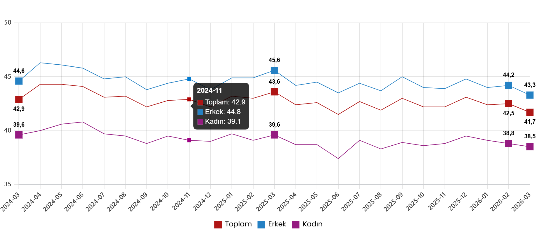 İşgücü, 2026 yılı Mart ayında bir önceki aya göre 129 bin kişi artarak 35 milyon 298 bin kişi, işgücüne katılma oranı ise 0,1 puan artarak %52,8 olarak gerçekleşti. İşgücüne katılma oranı erkeklerde %70,8 iken kadınlarda %35,3 oldu.