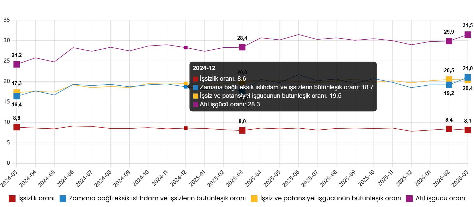 Zamana bağlı eksik istihdam, potansiyel işgücü ve işsizlerden oluşan atıl işgücü oranı 2026 yılı Mart ayında bir önceki aya göre 1,6 puan artarak %31,5 oldu. Zamana bağlı eksik istihdam ve işsizlerin bütünleşik oranı %21,0 iken işsiz ve potansiyel işgücünün bütünleşik oranı %20,4 olarak tahmin edildi.