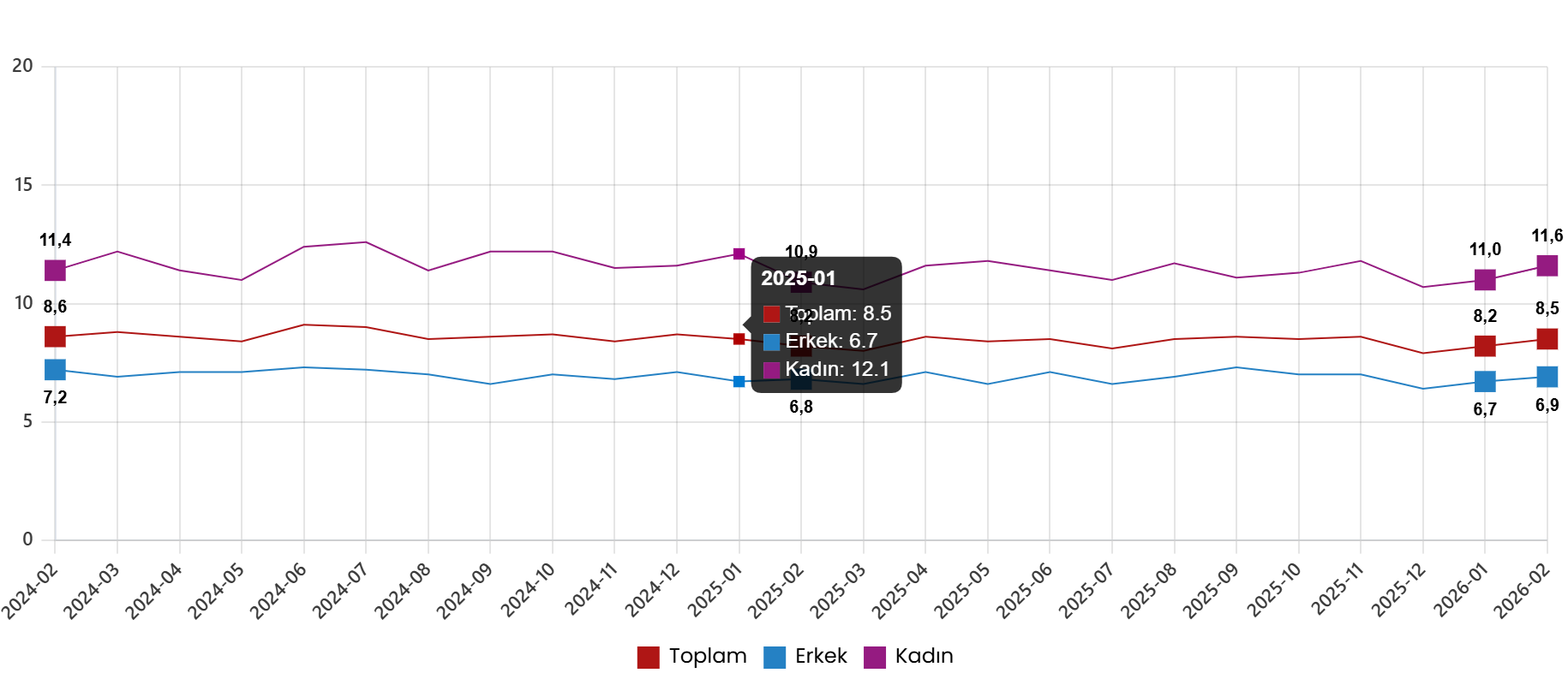Hanehalkı İşgücü Araştırması sonuçlarına göre; 15 ve daha yukarı yaştaki kişilerde işsiz sayısı 2026 yılı Şubat ayında bir önceki aya göre 133 bin kişi artarak 2 milyon 981 bin kişi oldu. İşsizlik oranı ise 0,3 puan artarak %8,5 seviyesinde gerçekleşti. İşsizlik oranı erkeklerde %6,9 iken kadınlarda %11,6 olarak tahmin edildi.