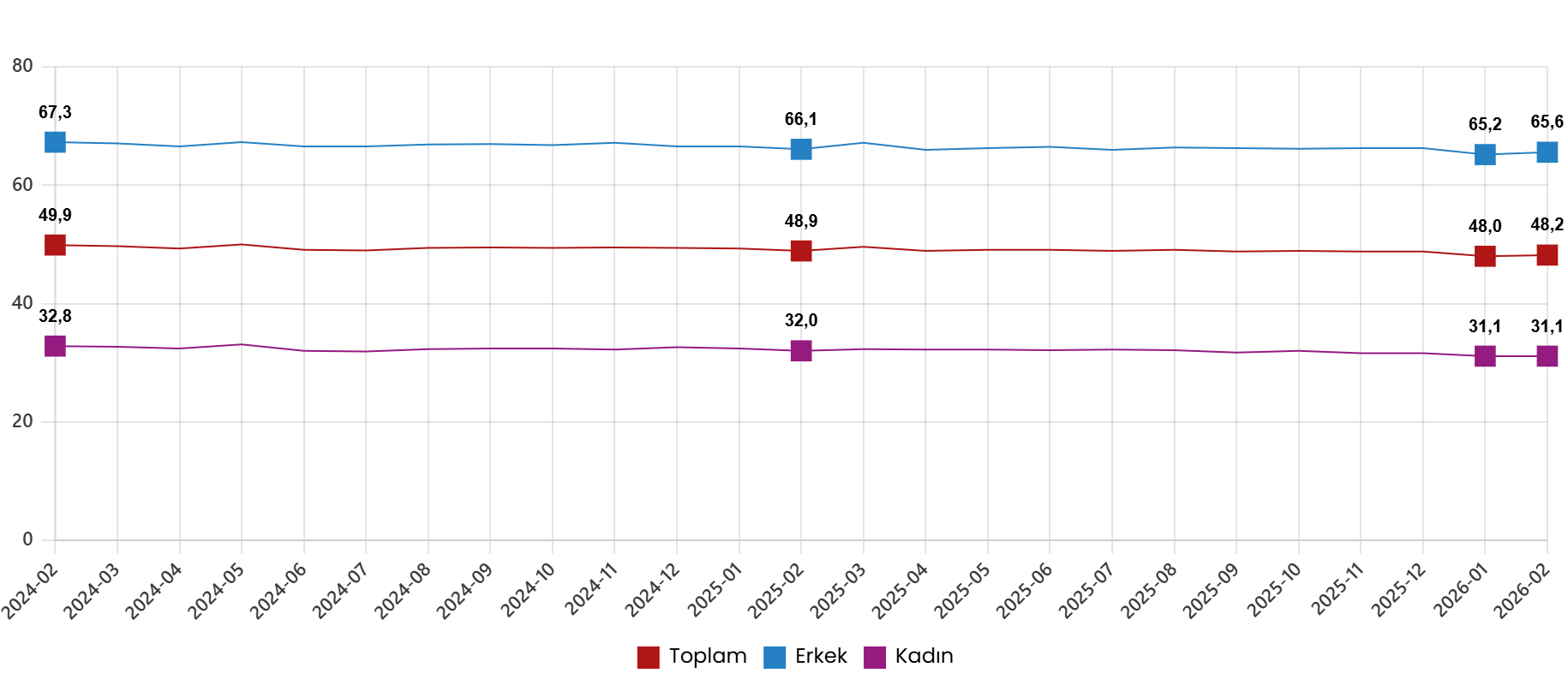İşgücü, 2026 yılı Şubat ayında bir önceki aya göre 286 bin kişi artarak 35 milyon 139 bin kişi, işgücüne katılma oranı ise 0,3 puan artarak %52,6 olarak gerçekleşti. İşgücüne katılma oranı erkeklerde %70,5 iken kadınlarda %35,2 oldu.