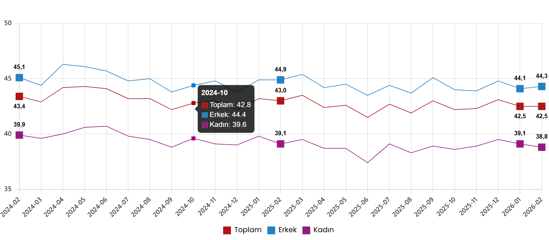 İstihdam edilenlerden referans döneminde işbaşında olanların, mevsim ve takvim etkilerinden arındırılmış haftalık ortalama fiili çalışma süresi 2026 yılı Şubat ayında bir önceki aya göre aynı seviyede kalarak 42,5 saat olarak gerçekleşti.