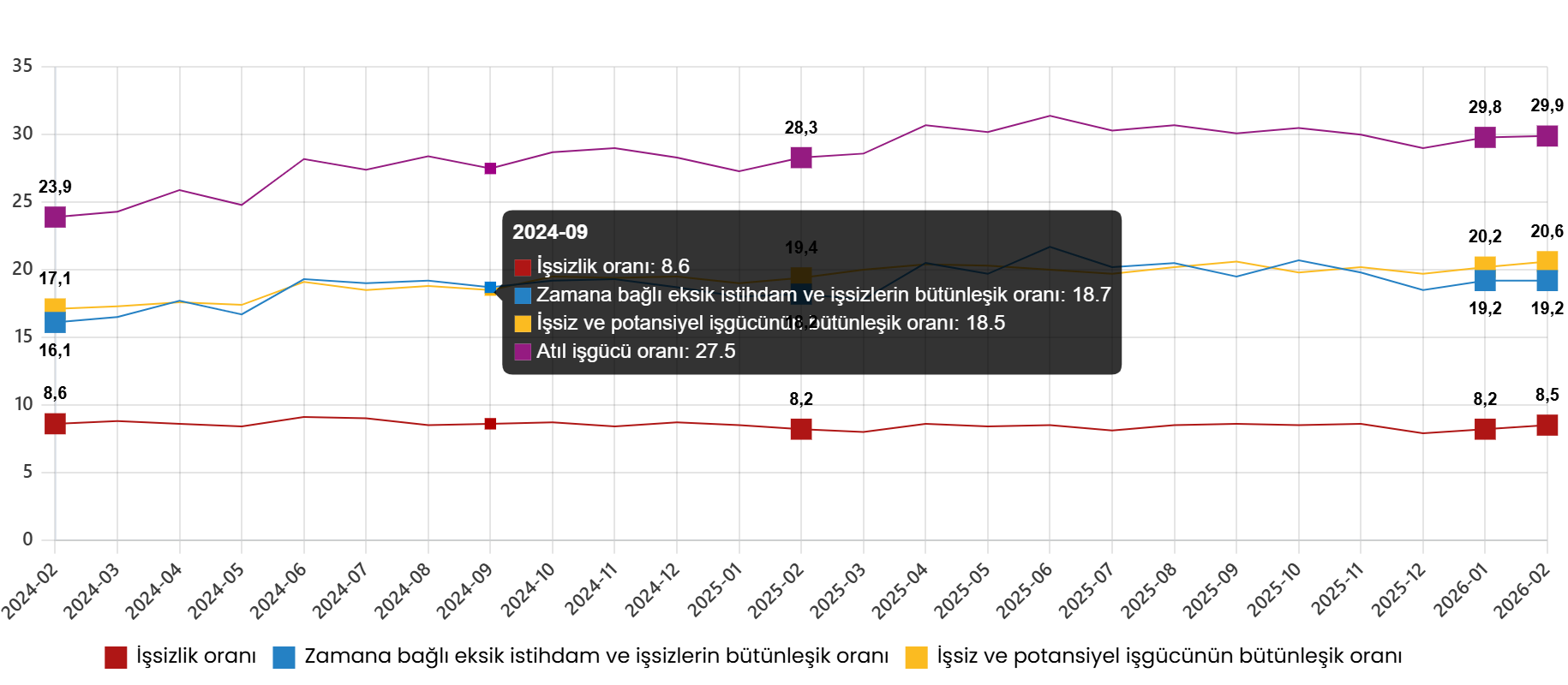 Zamana bağlı eksik istihdam, potansiyel işgücü ve işsizlerden oluşan atıl işgücü oranı 2026 yılı Şubat ayında bir önceki aya göre 0,1 puan artarak %29,9 oldu. Zamana bağlı eksik istihdam ve işsizlerin bütünleşik oranı %19,2 iken işsiz ve potansiyel işgücünün bütünleşik oranı %20,6 olarak tahmin edildi.