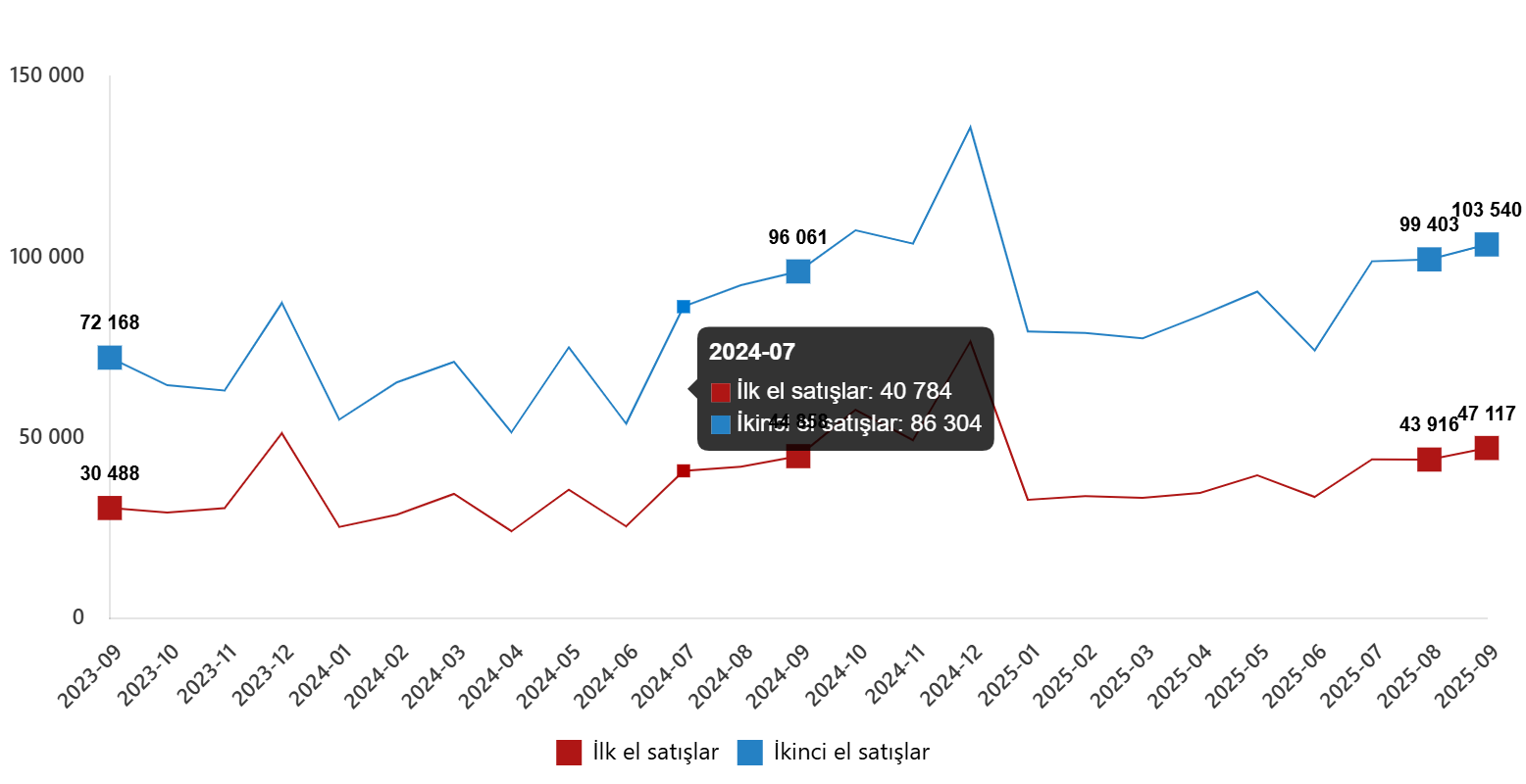 Türkiye genelinde ikinci el konut satış sayısı Eylül ayında bir önceki yılın aynı ayına göre %7,8 oranında artarak 103 bin 540 oldu. Toplam konut satışları içinde ikinci el konut satışının payı %68,7 oldu. İkinci el konut satışları Ocak-Eylül döneminde ise bir önceki yılın aynı dönemine göre %21,6 oranında artarak 786 bin 86 olarak gerçekleşti.