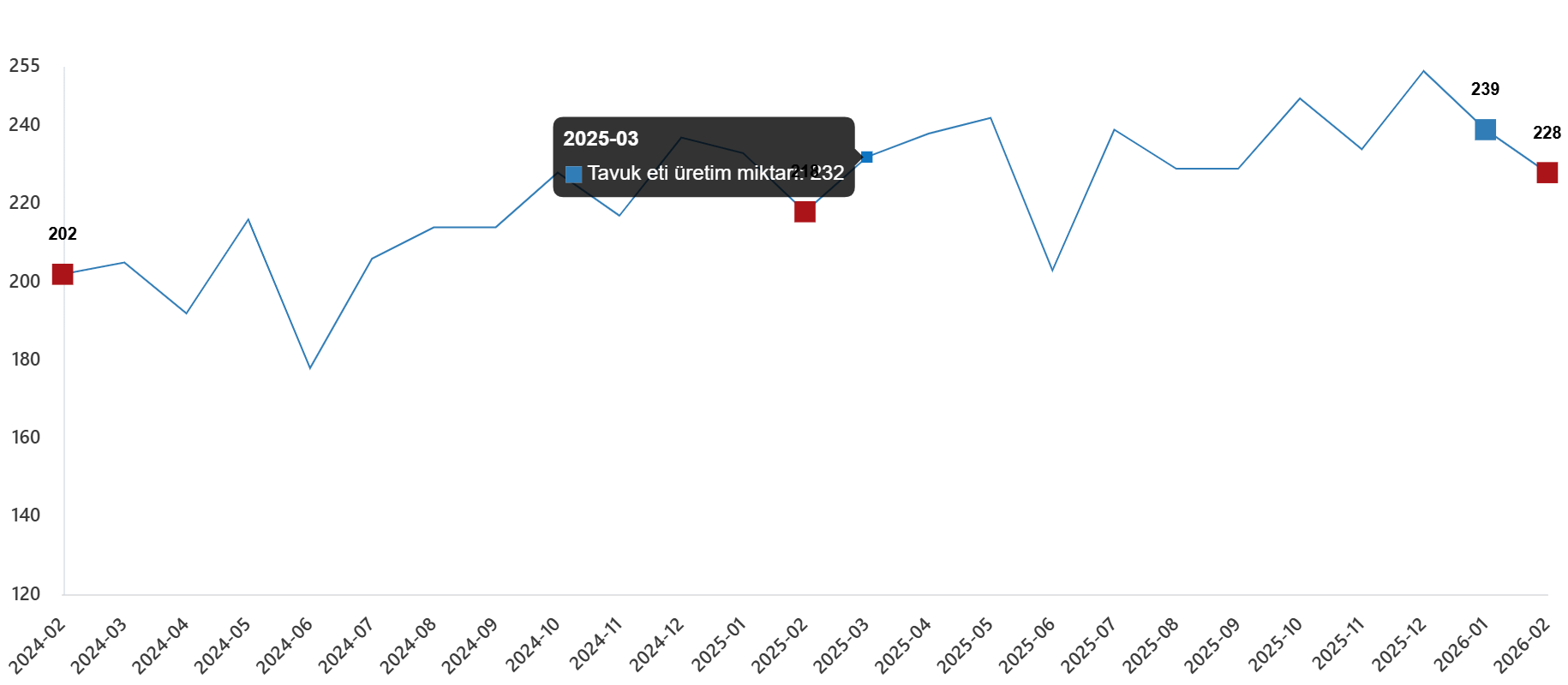 Bir önceki ay 238 bin 794 ton olan tavuk eti üretimi Şubat ayında %4,6 oranında azalarak 227 bin 793 ton oldu.