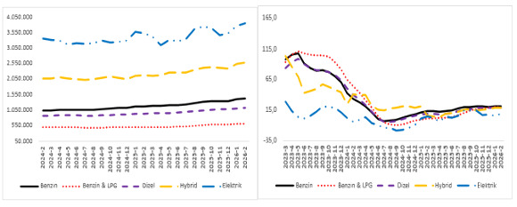 Şubat ayı verilerine göre yakıt türüne göre ortalama otomobil fiyatları incelendiğinde benzinli araçlarda ortalama fiyat 1 milyon 418 bin TL, benzin & LPG’li araçlarda 605 bin 450 TL, dizel araçlarda 1 milyon 117 bin TL, hibrit araçlarda 2 milyon 580 bin TL ve elektrikli araçlarda 3 milyon 833 bin TL olarak gerçekleşti. Yıllık değişim oranlarına bakıldığında ise benzinli araçlarda yüzde 20,7, benzin & LPG’li araçlarda yüzde 19,2, dizel araçlarda yüzde 18,7, hibrit araçlarda yüzde 18,9 ve elektrikli araçlarda yüzde 9,1 artış görüldü.