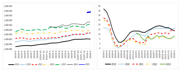 Şekil 5: Satılan otomobil sayısının satılık otomobil ilan sayısına oranı (%) (Sol panel), satılan ve satılık otomobil sayısı (Sağ panel)